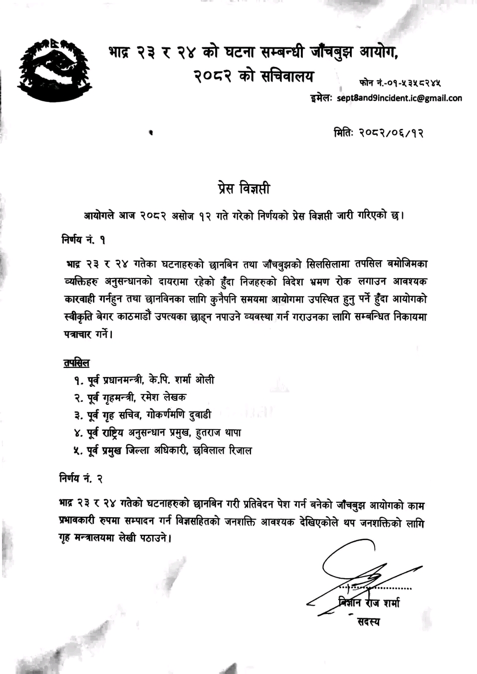 भदौ २३ र २४ को आन्दोलनको छानविन गर्न गठित जाँचबुझ आयोगले उनीहरूको विदेश यात्रामा रोक लगाएको आयोगका सदस्य विज्ञानराज शर्माले बताएका हुन ।